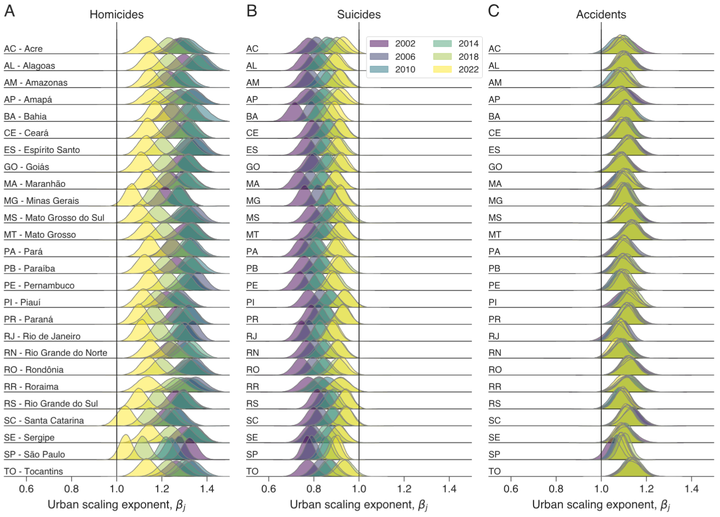 Urban scaling theory posits that urban indicators follow power‐law relations with population, yet the evolution of these patterns - and the role of regional differences in settings marked by social inequalities and unplanned urbanization - remains poorly understood. Here, we analyze nearly three decades of mortality data from Brazilian cities to investigate the scaling of external causes of death: homicides, suicides, and accidents. Using a hierarchical Bayesian framework and spatial correlation analysis, we find that these mortality indicators exhibit distinct, regionally heterogeneous scaling trajectories. Homicide mortality has significantly attenuated its typical superlinear scaling with increased spatial clustering, suggesting a redistribution of violence to smaller cities and intensified intercity interactions, possibly linked to the consolidation of organized crime. Suicide mortality, usually sublinear, has trended upward, implying a weakening of urban agglomerations' protective effect. Accident mortality remains superlinear, with transport fatalities scaling nearly proportionally, and non-transport accidents becoming superlinear. The scaling changes for suicides and accidents coincide with less correlated and stable spatial patterns, suggesting that the underlying processes predominantly operate within city boundaries. Finally, while scaling exponents have evolved more homogeneously across Brazilian states, scale-adjusted mortality remains highly heterogeneous, indicating that fundamental processes govern scaling laws, whereas state‐specific factors drive scale‐adjusted metrics.